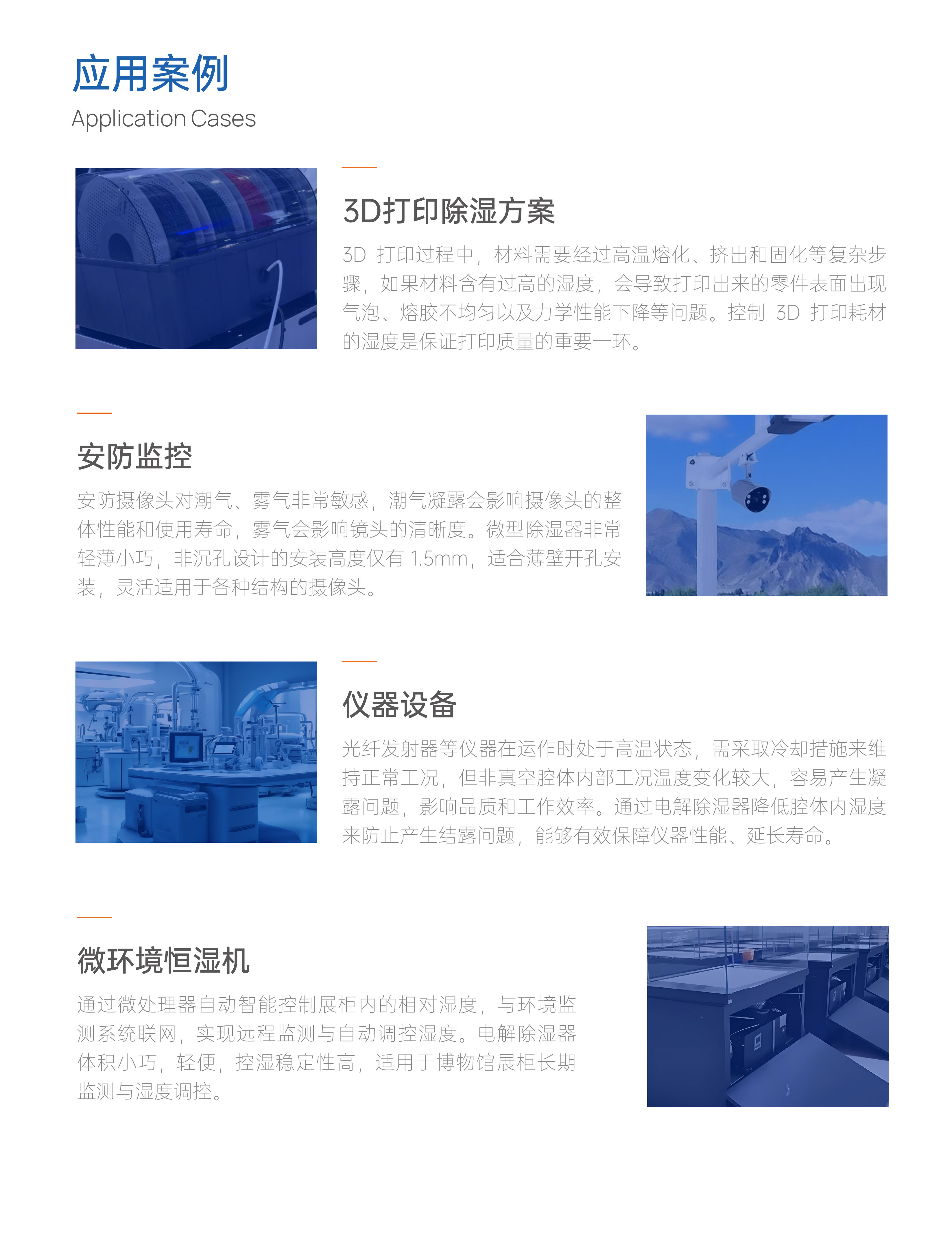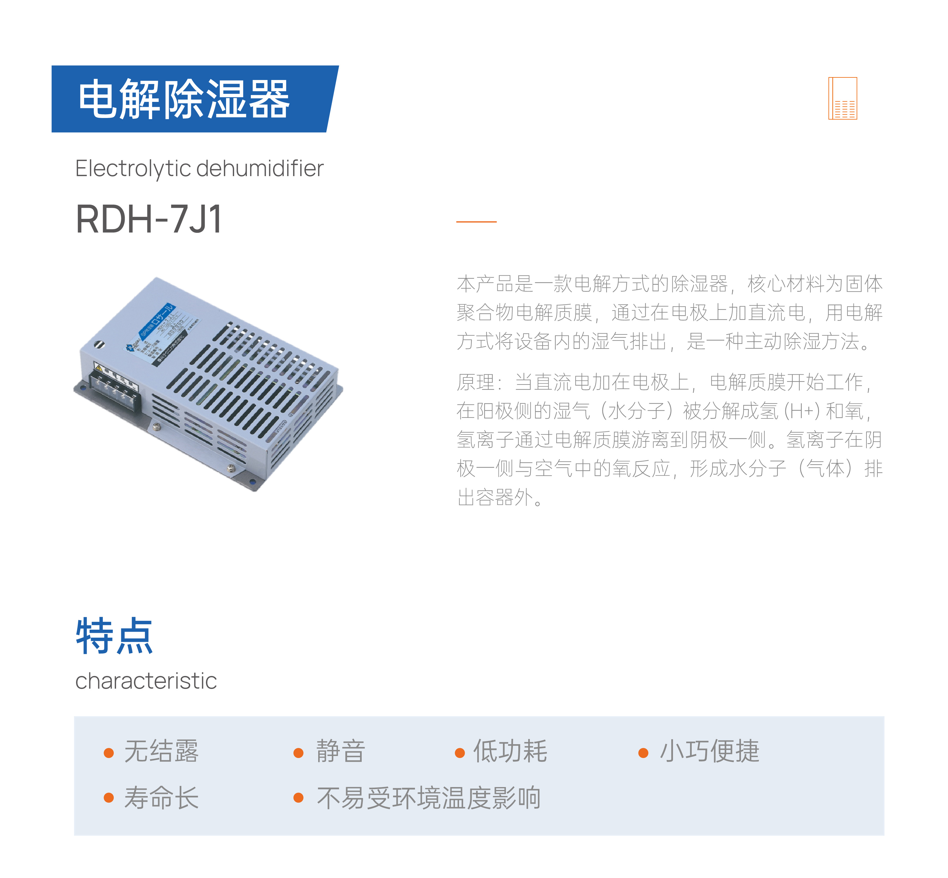 本产品是一款电解方式的除湿器,核心材料为固体聚合物电解质膜,通过在电极上加直流电,用电解方式将设备内的湿气排出,是一种主动除湿方法,原理:当直流电加在电极上,电解质膜开始工作在阳极侧的湿气(水分子)被分解成氢(H+)和氧氢离子通过电解质膜游离到阴极一侧。氢离子在阴极一侧与空气中的氧反应,形成水分子(气体)排出容器外。